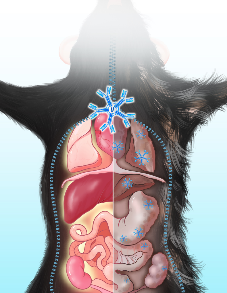 1. IgM在小鼠多组织中随衰老累积的示意图。(图片展示了小鼠从年轻(左)到年老(右)的演变,蓝色的IgM分子在年老小鼠的多个器官中显著富集,寓意其可作为追踪组织/器官衰老和评估抗衰老干预效果的通用生物标志物)