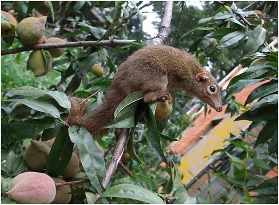 中缅树鼩为灵长类的近亲,在分类上属哺乳纲攀鼩目(Scandentia)树鼩科(Tupaiidae),根据外部毛色及形态特征,可分为6个亚种,即:滇西亚种(T.b.chinensis)、高黎贡山亚种(T.b.gaoligongensis)、海南亚种(T.b.modesta)、越北亚种(T.b.tonquinia)、滇南亚种(T.b.yunalis)以及瑶山亚种(T.b.yaoshanensis)。中缅树鼩形似松鼠,头骨的眶后突发达,形成一骨质眼球,脑室较大,吻部尖长,犬齿细小,前臼齿宽大,前后足均具有五趾,每趾都有发达而尖锐的爪。滇西亚种(T. b.chinensis)是我们目前所广泛研究的种类,体较小,成年体重在150g左右,体背与体侧均为橄榄绿或橄榄灰绿色,腹部灰白色或棕黄色,肩纹白色且较明显,尾毛蓬松并向两侧伸展。中缅树鼩为昼行性动物,善于攀缘,行动敏捷,多在地上活动和休息。其食性较杂,喜食无脊椎动物和水果。中缅树鼩的领地意识明显,通过不同的叫声、丰富的视觉信号、特殊气味的分泌物等识别环境与相互联系,但对外界环境的变化极为敏感,受到外界不确定性刺激或突然身处陌生环境,容易产生焦躁、抑郁情绪。 |