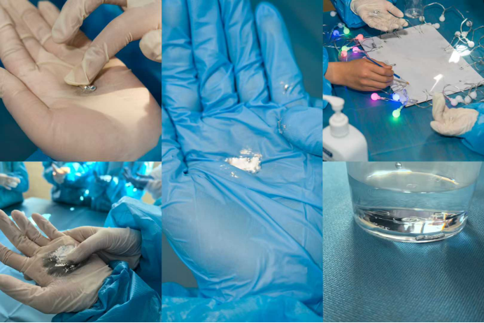 本期课程最吸引人的趣味科学“镓”液态金属变形记系列实验,通过三个小实验来给学生体验了液态金属的独特性能。“遇水即化”实验在热水作用下,固态金属球会“融化”成亮银色液滴,孩子们亲眼见证金属从固态变为液态的神奇全过程。液态金属合金实验,让孩子们把液态金属鎵和金属铟融合在一起,通过手中的体温让固体金属在手中流动起来。“未来工程师”液态金属导电实验则显现了液态金属的导电性,当金属融化变成“柔性电路材料”,孩子们用画笔蘸取液态金属材料链接电路两端,彩色灯球就导电亮起,无需焊接、不用复杂工具,就能实现柔性电路设计。每个孩子通过实验都更加直观的了解了液态金属的特性和用途,大家都惊叹于这样的特殊材料。