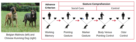 近日,中国科学院昆明动物研究所王国栋研究员团队以来自公安部昆明警犬基地的52只马里努阿犬和昆明犬(4-12月龄)为对象,系统开展了包括工作记忆、手势指示、标记物指示、身体vs手势和气味控制五项的经典社交线索测试。结果表明,这些警犬在不同测试项目上表现出了显著差异:对手势指示和标记物指示的反应均明显优于气味控制,但对物品标记线索的理解则显著高于对人类手势的理解。